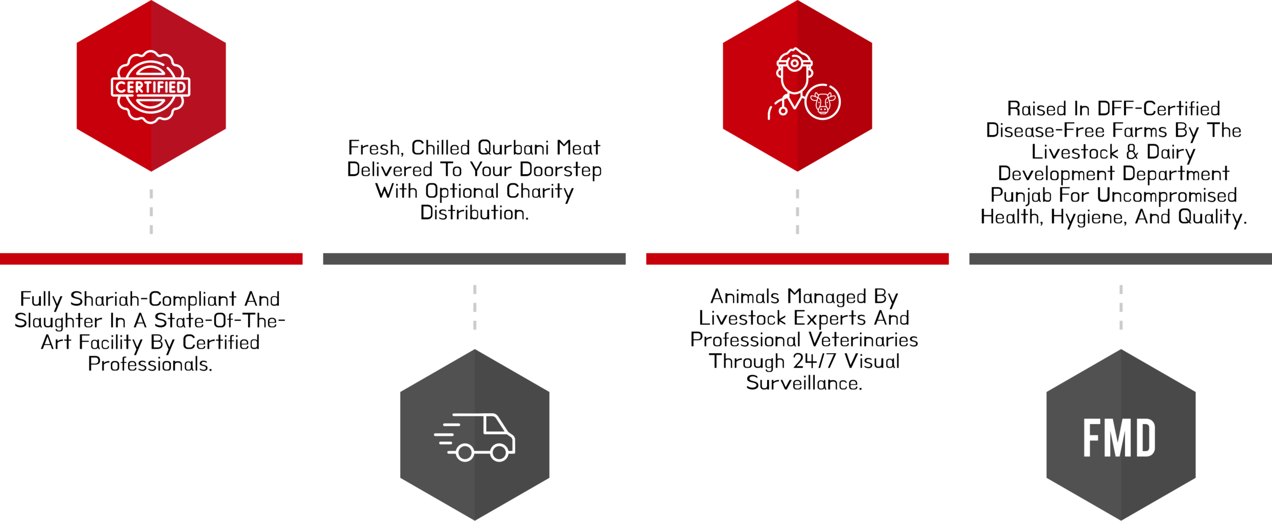 From careful selection and proper handling to 100% Shariah-compliant Qurbani and hygienic meat distribution, every step is managed with precision and transparency, giving you complete peace of mind for worry-free Qurbani.
